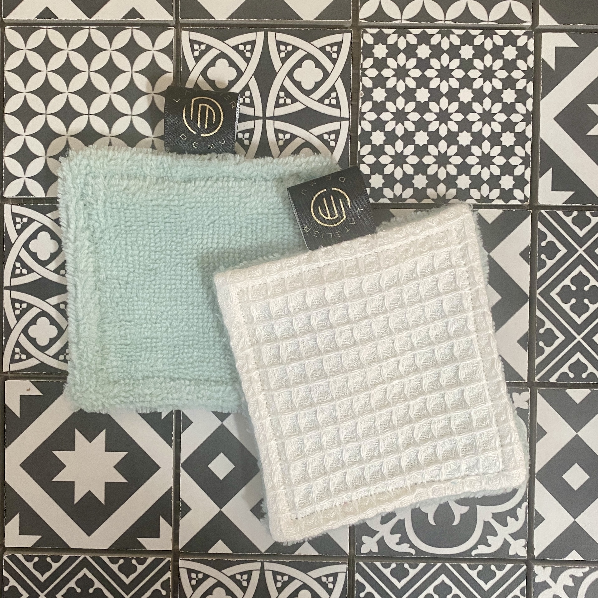 Lot de 2 lingettes, une face en éponge bambou, l’autre en coton nid d’abeille. Toutes douces sur la peau, parfaites pour le nettoyage du visage ou le démaquillage. Dimensions : 9 cm x 9 cm. Lavable en machine à 30 degrés. Imaginée par l’Atelier de Mu. Confectionnée à La Réunion